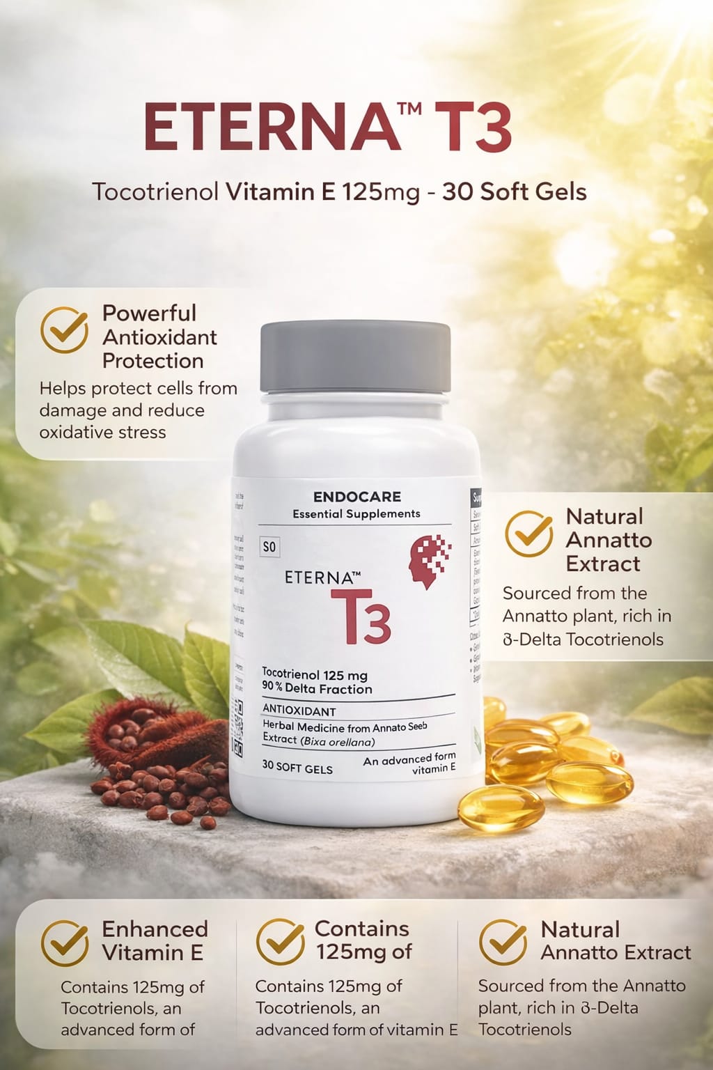 Support your wellness with ETERNA™️ T3 Tocotrienol Vitamin E, an advanced form of Vitamin E derived from Annatto Seed Extract (Bixa orellana). Unlike regular Vitamin E, tocotrienols are known for their powerful antioxidant properties and may offer enhanced cellular protection and wellness support.